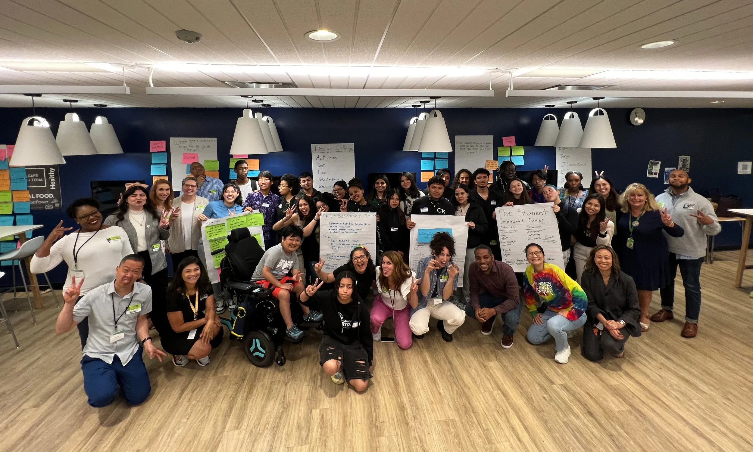 Designers in Residence Cohort 2.0 and Education Design Lab staff with high school students from Arlington Career Center, Arlington, VA, during project kick-off convening. (Photo credit: Stephanie Ogilvie Seagle, Communications Director, Education Design Lab)