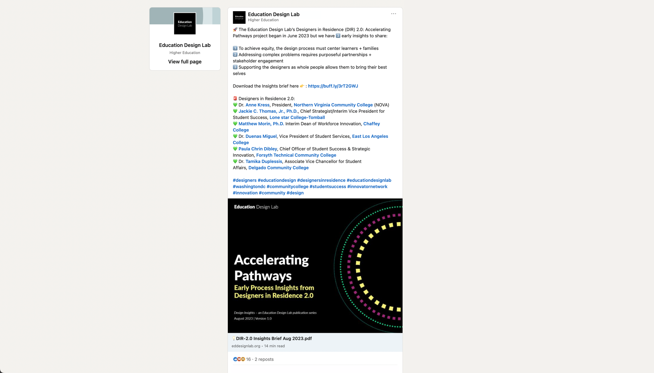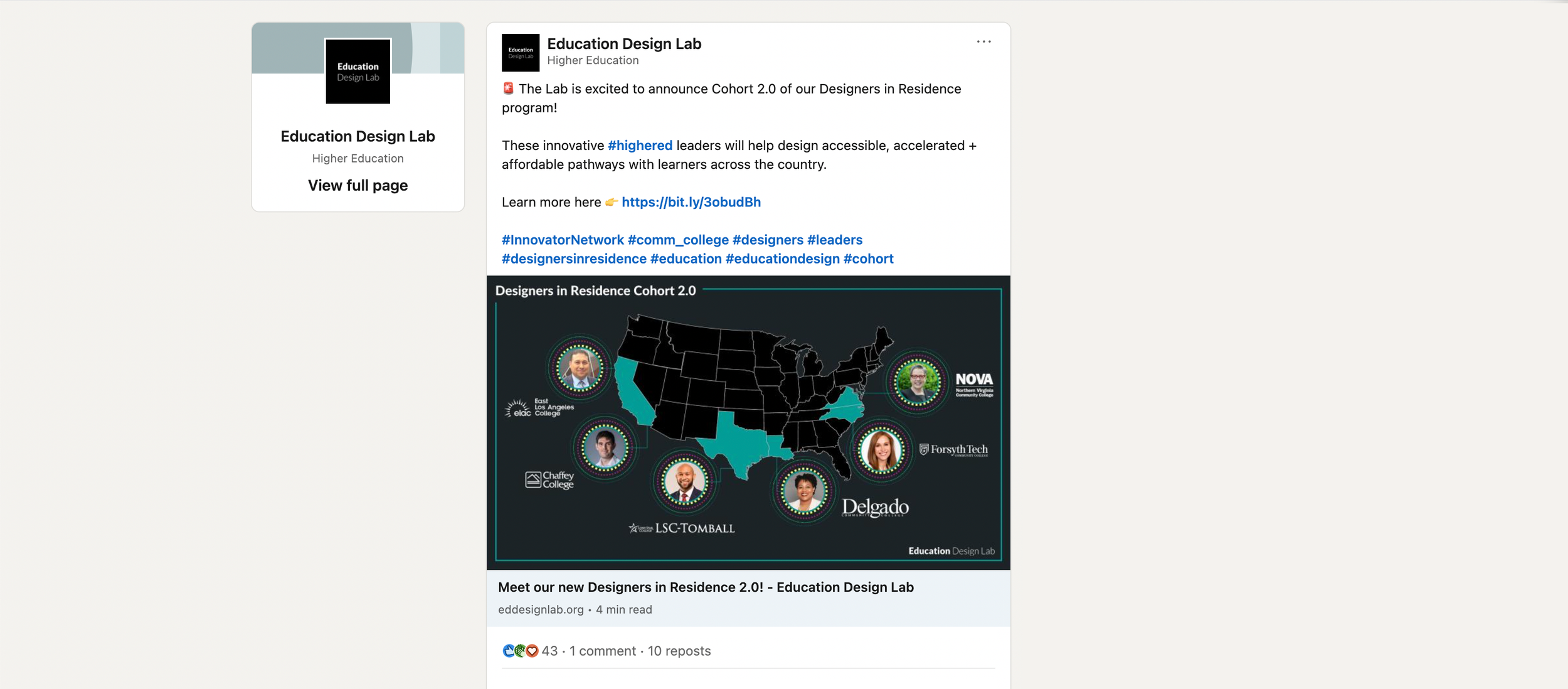 Using Education Design Lab’s style guide, the first task was to design a graphic to post across the Lab’s social media channels to promote the application to senior leaders from US postsecondary institutions.