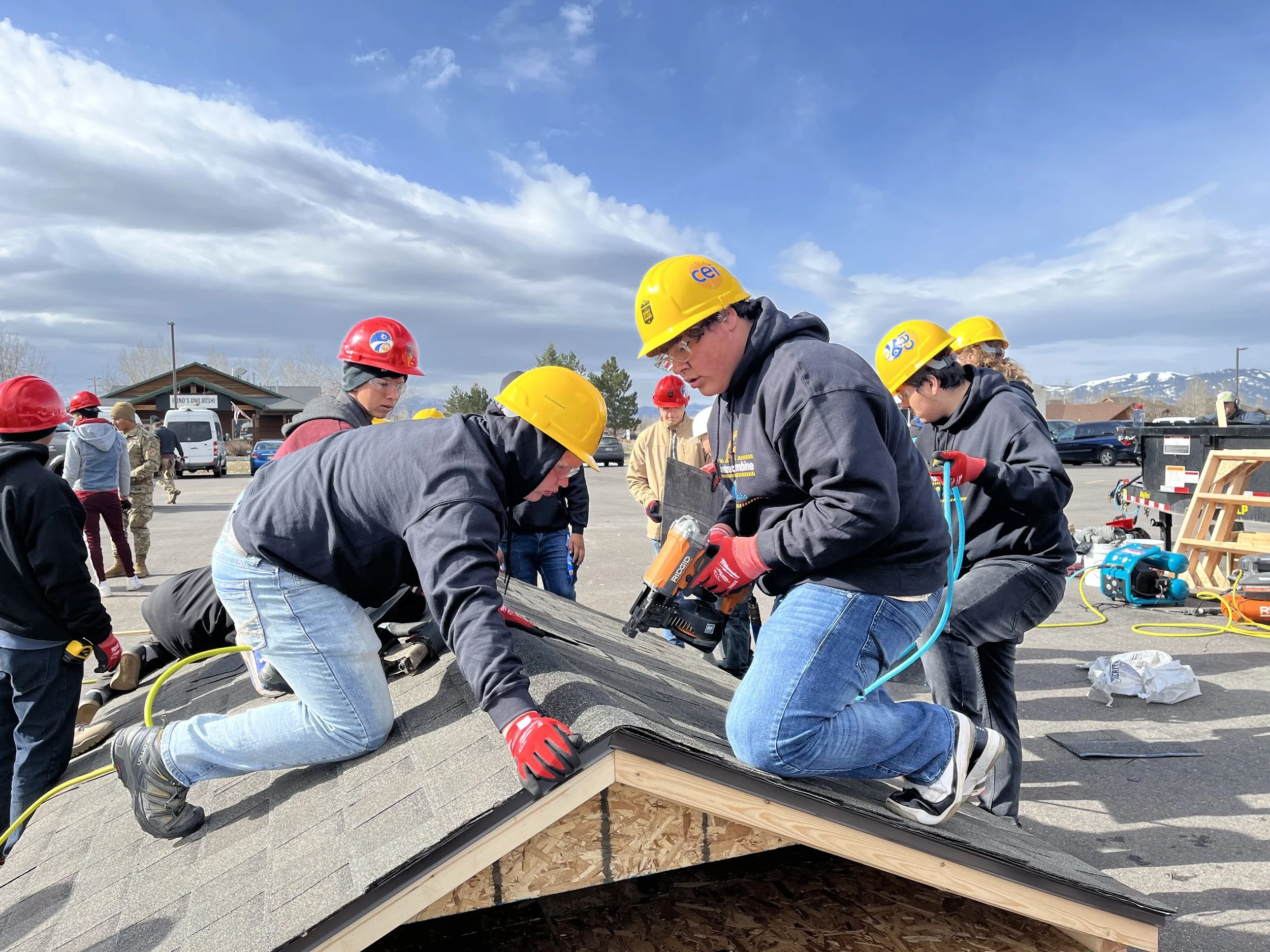 Action shot from Day 2 of the Construction Combine, hosted by Central Eastern Idaho, as part of their BRIDGES Rural pilot. Students worked alongside experienced contractors to learn framing, drywall, concrete, and more skills, and on the second day, they built sheds that were donated to community causes. (Photo credit: Nishita Chheda, Education Designer, Education Design Lab)